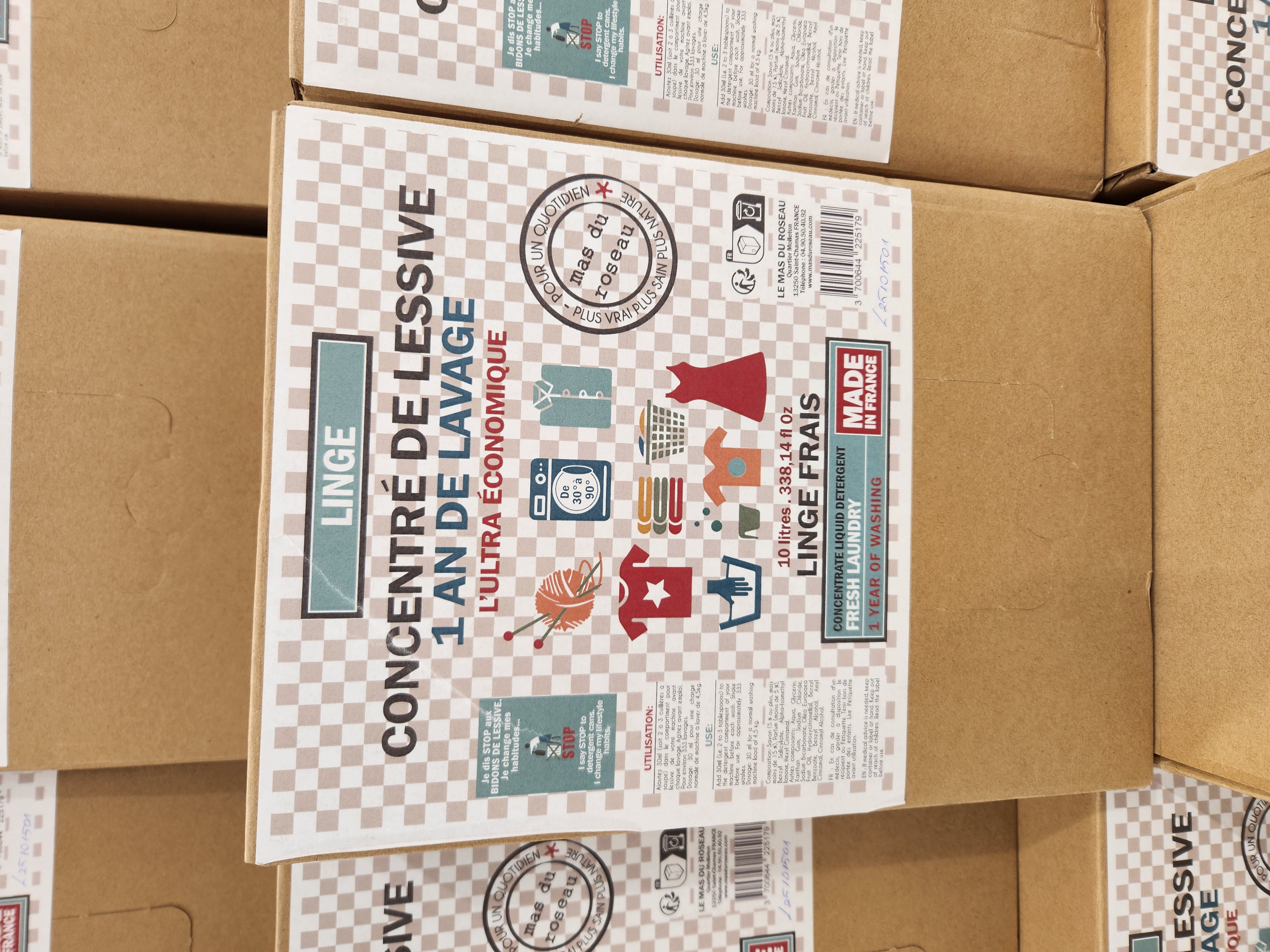 Cette lessive est à base de savon noir, bicarbonate de sodium et eau. Elle est enrichie d’un parfum à base d’huile essentielle de grasse.